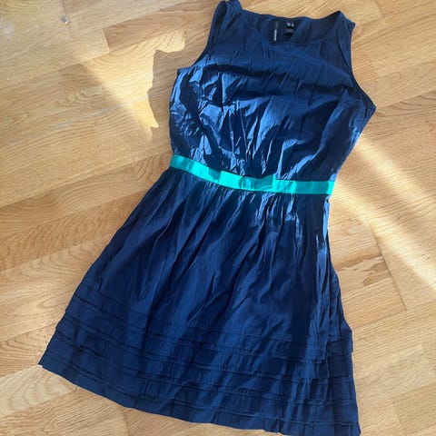 Mango kjole strl S. Kjolen har brodert mønster på overdelen. Den har en løs passform med belte i midjen for justering. Pene knapper i ryggen.