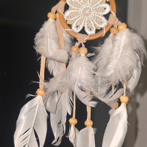 Drømmefanger i grønne og brune toner, med tykk hyssing og fjær 🪶🦚