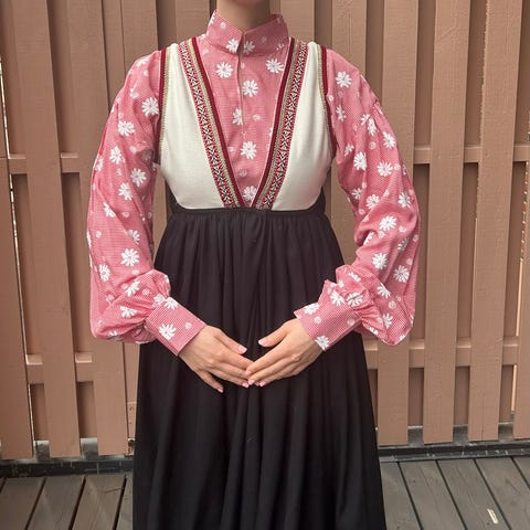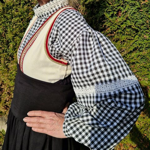 Selvsydd, ubrukt bunadskjorte sydd av duk fra Fretex. Må gjerne prøves.