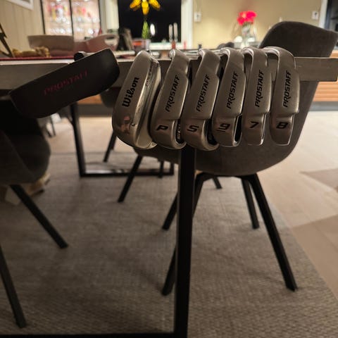 Har en del gamle golfkøller. Driver og 3-wood som er helt kurante. 5-jern og 7-jern som er fine. Royal Golf pitching wedge som er maks 5 år gammel.
