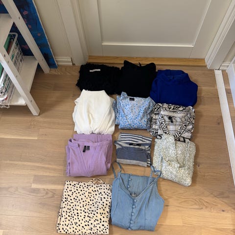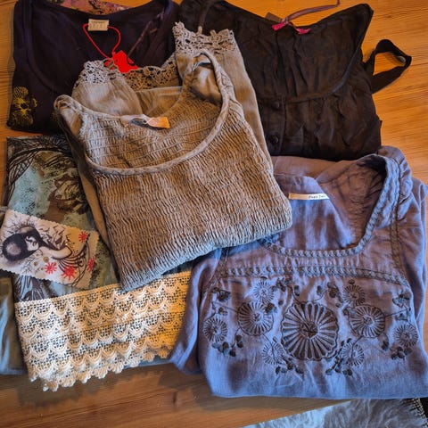 Klespakke med topper, kjoler og skjørt. Alt er i størrelse M eller størrelse som er tilsvarende M. Til sammen 9 plagg. Selges for 350kr