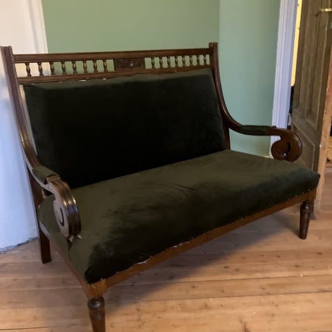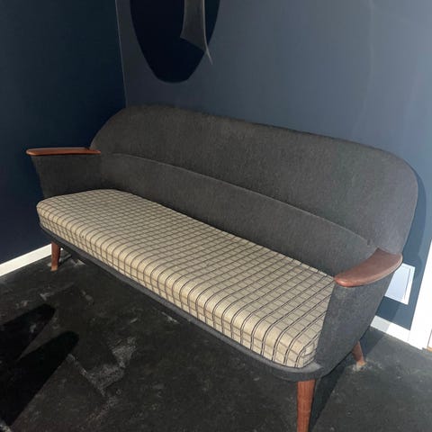 Vintage sofa med mørkegrønt stripet stoff