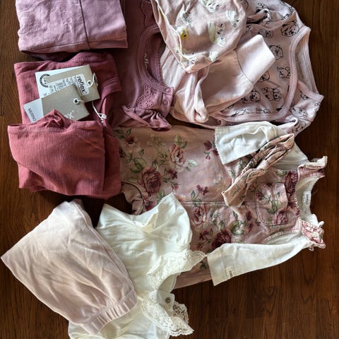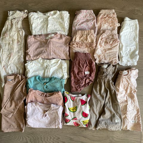 Klespakken inneholder åtte plagg; fire bodyer, en cardigan, en pyjamas, en heldress og en selebukse.