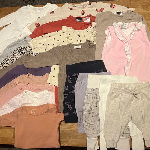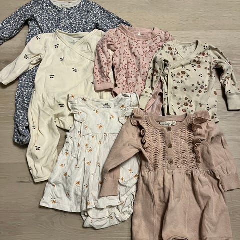 Merke på plagget står under hvert bilde. Alle klærne er i størrelse 62. Finner ingen anmerkninger utover vanlig bruksslitasje. Fremstår i god stand.