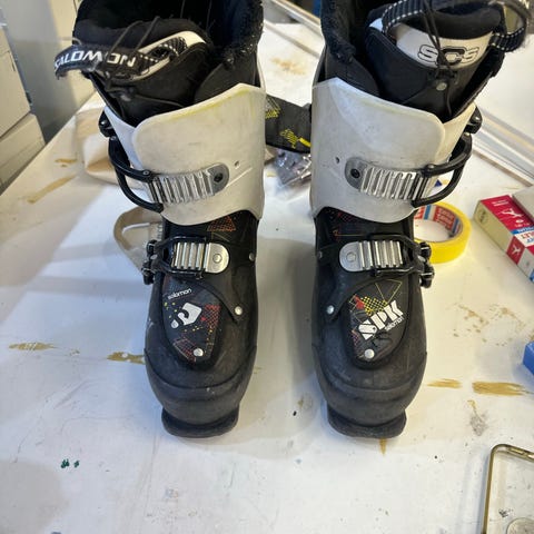Salomon skistøvler i størrelse 230-235 Momondo (tilsvarer 36,5-37) med hvit og svart farge. Støvlene har justerbare spenner og polstret innside for komfort. Egnet for alpinski.