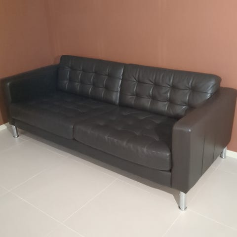 Interia sofa, mykt skinn. Kjøpt på Interia i Trondheim. Pent brukt, står på en loftsstue som ikke brukes så mye. Lengde 207 cm. Kaldskumputer, god sittekomfort. Ben i børstet stål.