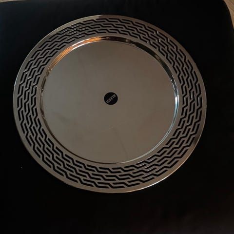 Alessi Ba-rock serveringsbrett laget av rustfritt stål med to håndtak dekorert med grønne perler. Brettet har en rund form og egner seg for servering av mat og drikke.