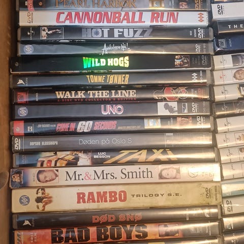 To esker med dvd og blu ray filmer selges samlet. Begge eskene er fulle. Mange forskjellige titler, mest i kategorien thriller/action.