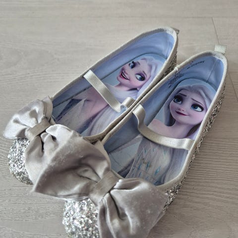 H&M Frozen jente sko i størrelse 32 med sølv glitterdetaljer og sløyfe på fronten. Skoene har elastisk stropp over vristen for bedre passform. Motiv fra Disney Frozen på innsiden.
