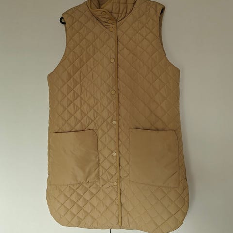 Lindex jakke i størrelse L for dame. Jakken har en beige farge og et quiltet mønster. Den er uten ermer og har to lommer foran. Laget med knapper i front for lukking. Lengde 90 cm, kan sende