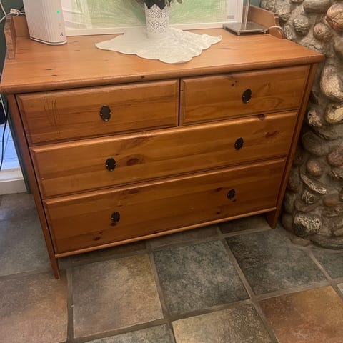 Et solid kjøkkenbord med to stoler gis bort. Bordplaten og stolene har noen merker i overflaten.