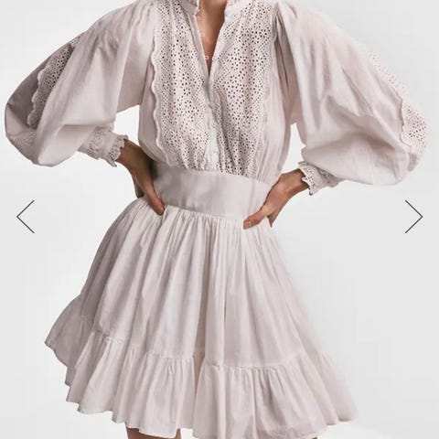 Bestselger fra ByTiMo. Cotton Slub Mini Dress er kuttet i en lett og myk kvalitet med slubdetaljer. Den har en tilpasset midje med smock i ryggen og et voluminøst a-formet skjørt. Kjolen har overdimensjonerte, vintage-inspirerte ermer og broderie anglaise-innlegg på brystet, ermene, mansjettene og halsen. Detaljert med knapper foran og volang langs skjørtet.