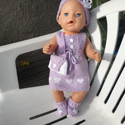 Bursdagskjole, dukkebunad, dukkefestdrakt, kake, sko, tøfler, pc, briller, laptop, Mac, rosa kjole, lue, skjørt, genser, morgenkåpe, vinterklær, lue, votter, jakke, dukkejakke, kyse