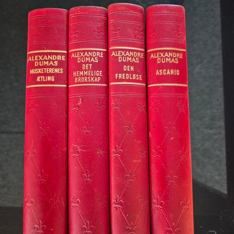 Alexandre Dumas Innbundet Boksamling med røde lærbind. Inneholder flere titler med preget dekor på ryggen. Passer for samlere eller til dekorativ bruk.
