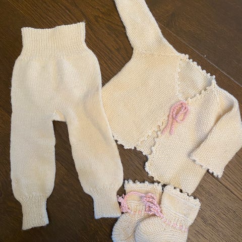 Hellesett i lys blå og hvit. Strikket i str 3 mnd slik at man kan ha det fra nyfødt og de første månedene til babyen. Settet er strikket i merinoull istdedetfor bomull. Ull har bedre egenskaper og holder seg bedre enn bomull. Dette settet betalte jeg 1400 kr for å få strikket i lilla og hvit, men damen som strikket det kjøpte blå og mente det var lilla. Selges derfor videre helt ubrukt