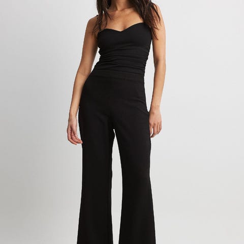 Disse buksene har en høy midje-passform. De har utsvingte ben og en lukking med glidelås og hekte på siden.