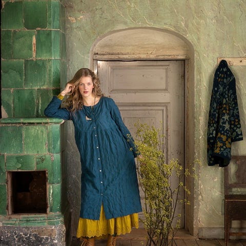 Veldig fin kjole i tynn økologisk bomull som er luftig å føles deilig mot huden. Dette er en kjole som har sånn fasong at alle burde ha en i skapet og ta på når andre ting ikke passer. Kjolen har lommer og vil garantert bli en favoritt. Bruk med sandaler på sommeren og støvler om vinteren. Alltid fin.
