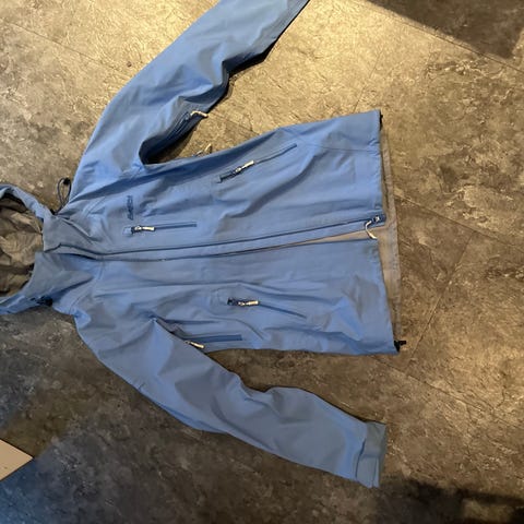 Bergans regntøyjakke i blå farger, størrelse XS for kvinner. Jakken har hette og glidelås, designet for utendørs bruk i vått vær. Materialet er vanntett og pustende, egnet for regnvær og fuktige forhold.