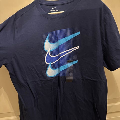 Nike T-skjorte i størrelse L, farge rød. T-skjorten har en løs passform og er laget i et mykt materiale. Den har rund hals og et lite brodert Nike-logo på brystet.