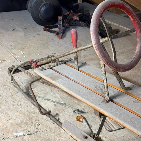 Eldre rattkjelke av litt spesiell konstruksjon. Her er skiene leddet litt foran midten slik at den fremste delen vris når en svinger. Stålbeslåtte ski.