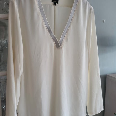 "Lang erm , V hals. Blusen er litt lengre bak enn fremme.