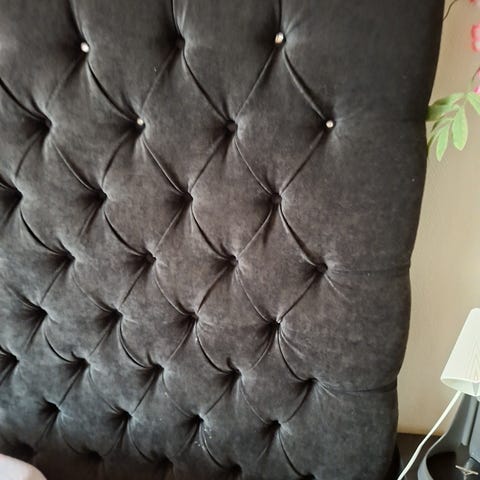 Jotex sengesgavl i grå stoff, designet for enkel montering bak en 90 cm bred seng. Sengesgavlen har en polstret overflate med knappdetaljer, og er laget for å gi støtte og estetisk tilleggsverdi til soverommet.