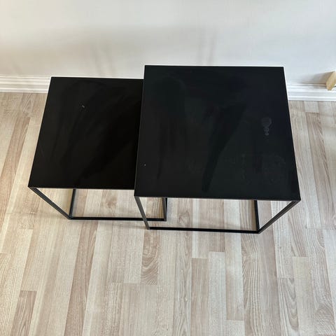 Selger brukt sofabord. Det er bruksmerker som man kan se på bildene på beina. I glassplaten kan man også se litt riper fra glass, men ellers i god stand☺️