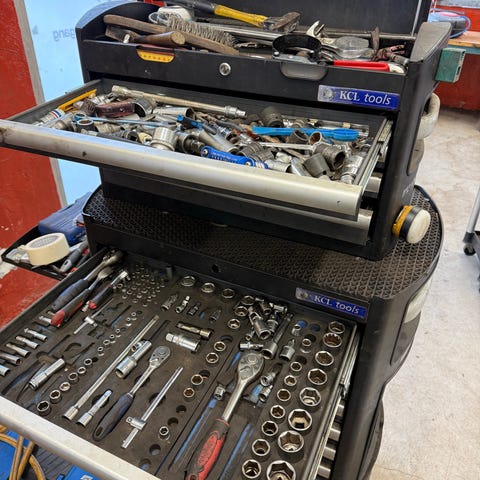Diverse spesialverktøy, blant annet momentnøkler, forlengerstenger og universalledd.