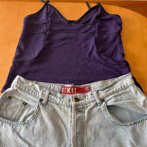 Topp med litt høy hals. Splitt, litt lengre bak.