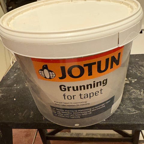 Ca. 6 liter igjen fra et 10 liters spann med Jotun grunning for tapet selges billig. Et kvalitetsprodukt som klargjør tapetet til overmaling.