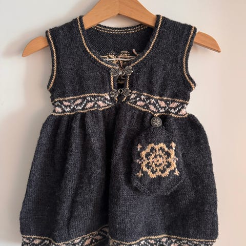 Nydelig hjemmestrikket kortermet kjole/tunika. Ca str 68, se mål. Hvit body str 68 kan medfølge dersom ønskelig (har anmerkninger, se bilde) . Fra røyke og dyrefritt hjem.
