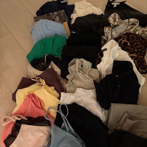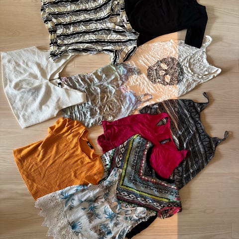Klespakke med bluser topper og T-skjorte i størrelse 38 for kvinner. Inneholder flere T-skjorter i ulike farger og mønstre, laget av tekstilmateriale. Passer til hverdagsbruk og ulike anledninger. Fine til kontoret. rykkete fordi de har ligger krøllet