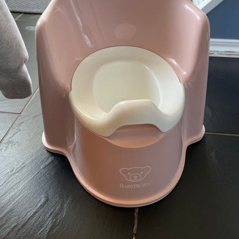OK Baby barnepotte laget av plast i grå og hvit farge. Designet for barn og enkel å rengjøre med avtakbar innerskål. Egnet for bruk på bad eller andre steder hvor barn trenger potte.