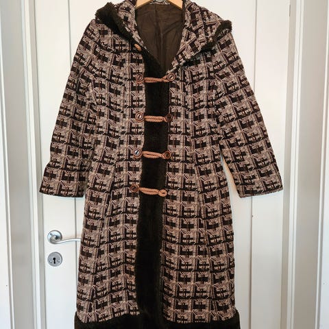 Nydelig kåpe i brokadelignende stoff selges da den er blitt for liten. Pelskanten er avtagbar.