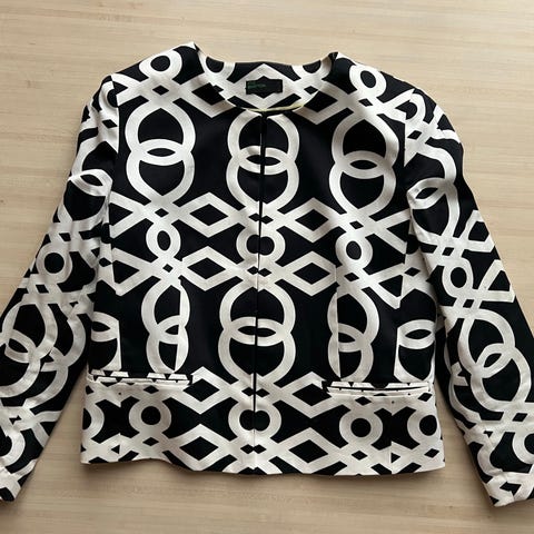 Klassisk jakke fra Benetton. En ordentlig pyntejakke. Fin til både bukse, skjørt eller over en kjole. Kort modell med litt vidde, 3/4 armer. Jakken er helfòret. Mønster i svart, lys beige og hvit. Italiensk str 38 - tilsvarer norsk str 34. Pent brukt, fremstår i perfekt stand.
