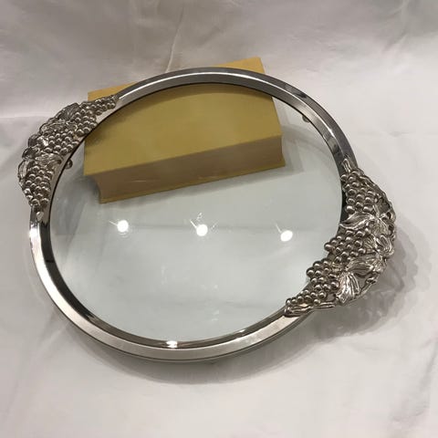Sett med ulike serveringsfat bestående av et rundt glassfat med rillet mønster, et rundt glassfat med bladmotiv, et rundt keramikkfat med blomsterdekor og et rundt keramikkfat med hvit kant og dekor. Fatene varierer i størrelse og design, egnet for servering av mat eller som dekorative elementer.