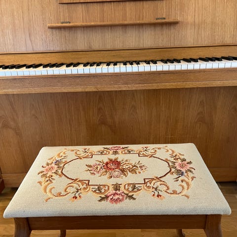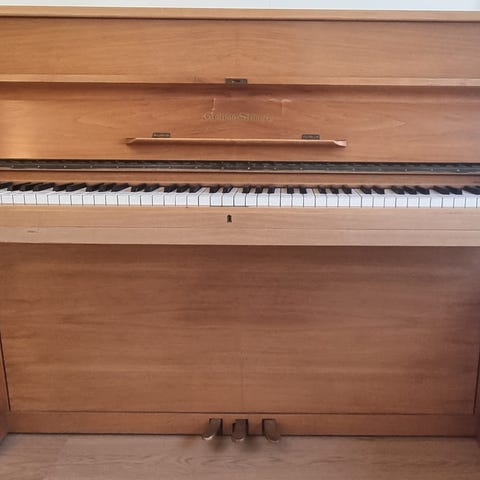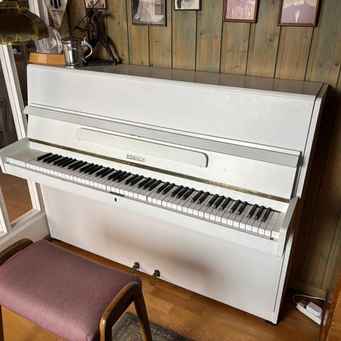 F. Hellström Piano i hvit farge med svart tilhørende benk. Pianoet har et klassisk design og 88 tangenter. Egnet for musikklæring og hjemmebruk.