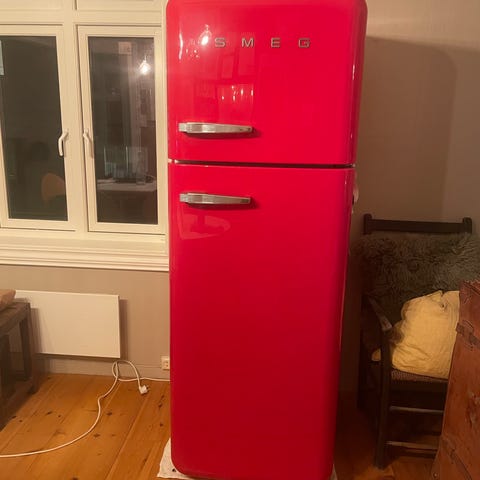 Smeg kombiskap med retrodesign i pastellgrønn farge. Kjøleskap og fryser i ett apparat, egnet for kjøkkenbruk. Trenger en god vask ☺️ stått ubrukt i kjelleren i et år.