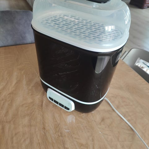 Sterilisatoren passer til flasker, smokker og brystpumpetilbehør og har et håndtak som er lett løfte, for å holde hendene borte fra dampen. Det stabile brettet med to nivåer kan også brukes som et tørkestativ.