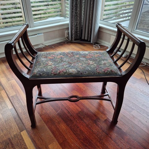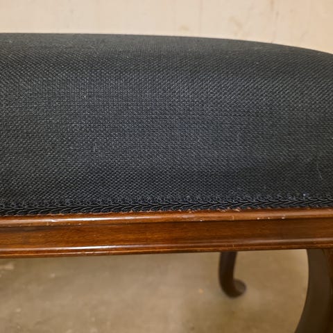 Pent pianokrakk med svingsete for å justere høyden. Må limes. Godt sittepute med hva som ser ut som silketrekk.