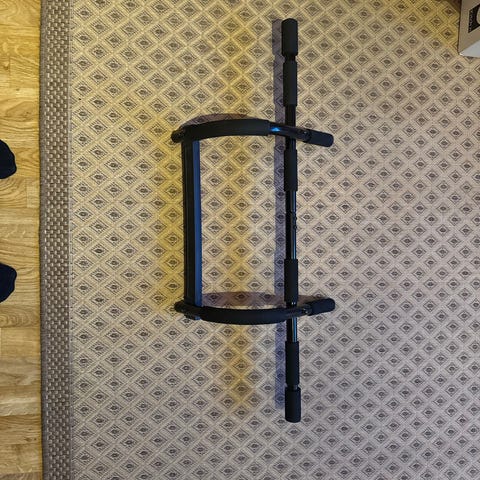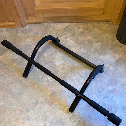 Iron Gym Pull-up Bar designed for doorway installation. Made of metal with foam grips for comfort. Suitable for upper body strength exercises such as pull-ups and chin-ups. Adjustable to fit different door frame widths.