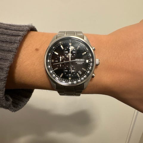Seiko Herreklokke i stål med sølvfarget lenke og sort urskive. Klokken har kronograf-funksjon med flere små urskiver og tydelige visere. Designet for herrebruk.