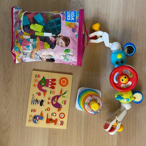 Fisher-Price stableleke med fargerike stableringer i plast, egnet for små barn. Inkluderer også en aktivitetsleke med ratt og figurer som lager lyd og blinker, supert på tur i vogn. Mega Bloks byggeklosser i ulike farger og størrelser. I tillegg følger et puslespill med dyremotiv i tre. Produktene er laget for å stimulere barns motoriske ferdigheter og lek.