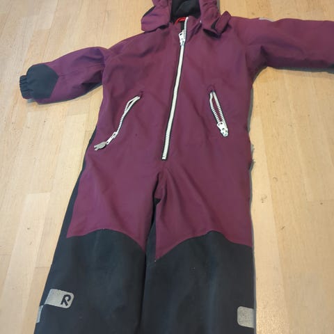 Reima vinterdress i størrelse 110, lilla farge, unisex modell. Kjeledressen er laget for barn og har flere lommer samt refleksdetaljer for økt synlighet. Stoffet er slitesterkt og egnet for utendørs bruk. Det er noen mindre tegn på bruk, inkludert små rifter og slitasjeområder på ben og armer, som vist på bildene.