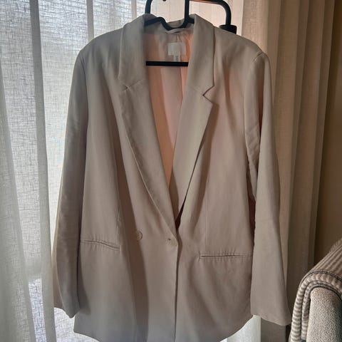 Blazer i en nydelig beigefarge fra HM. Utrolig deilig stoff, den er i 91% deilig viskose, som gir et eksklusivt preg. Jakken har en klassisk design med to knapper og to lommer foran. Enkeltspent, nett og fin på. Lommene har klaff som kan skjules eller has synlig. Reserveknapp følger med på vaskelappen. Fin med og uten belte på, og med ermer nede eller brettet opp. Passer til «alt» i formelle og uformelle anledninger. Jakken er i str. 48, og vil passe L og XL, samt fin som oversized til M. Jeg på bilder er en curvy M. Meget pent brukt! 💖