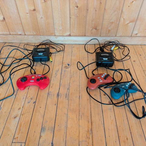 Sega Genesis kontroller sett i svart farge. Inkluderer to trådløse kontroller med standard knapper og retningstaster. Designet for bruk med Sega Genesis spillkonsoll.