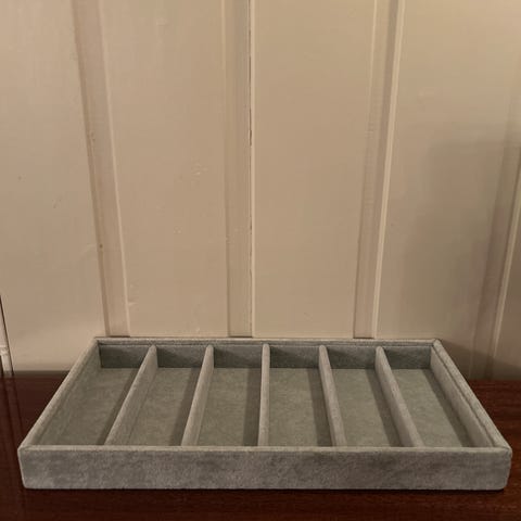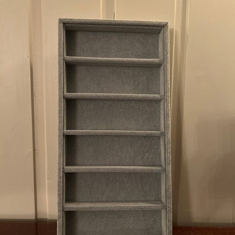 I grå fløyel med plass til 6 par solbriller. Perfekt til oppbevaring av solbriller i skuffer eller skap.