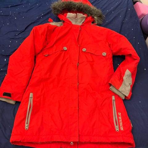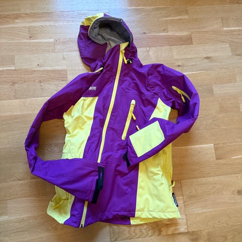 Svart jakke med rosa detaljer. Har snøstopp i midjen. Lufting under armene.