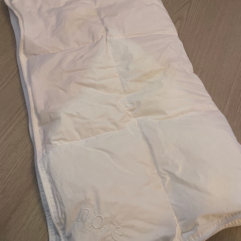 Vaskelappen er klippet av, men dyna kan vaskes på 60C og tromles. Brukt som helårsdyne her. Ny pris for tilsvarende dyner er 650-700 kr.
