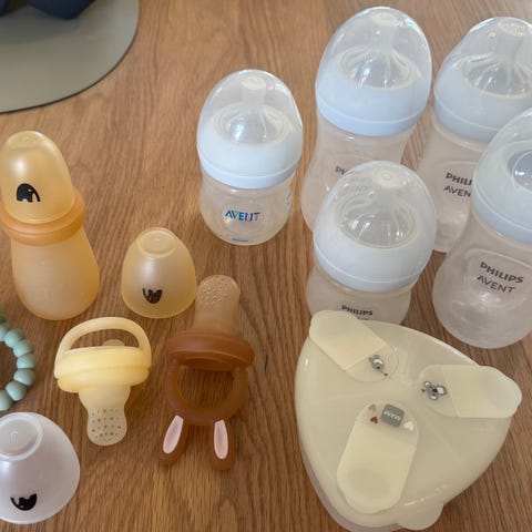 Avent tutekopper med diverse tilbehør. Uten flaskesmokker. To andre tutekopper følger også med (med flaskesmokker).